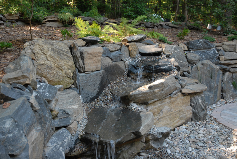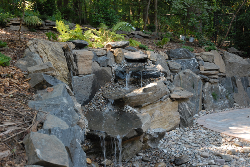 These customers were renovating their home and building an addition on a beautiful wooded property near Ridley Creek State Park. We designed and installed a new septic system and stormwater system to handle the runoff from the new addition and patio areas. We also excavated for the new addition, which was quite an undertaking as we had to bring in a blasting specialist to blast and break the Volkswagon- sized boulder typical of the area. We used the blasted/excavated rock to build a natural retaining wall around the new patio using selected pieces of rock to create a pond-less waterfall. The waterfall pond never needs refilling as it actually receives storm water runoff from the new addition downspouts and new patio, keeping it constantly full, with all of the overflow water piped to a newly installed storm water seepage pit.