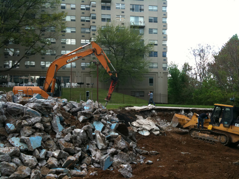 We provided pool demolition, excavation, filling and compaction to remove the existing, aging pool and prepare the site for a much more modern pool design. We demolished, removed, and recycled over 220 tons of concrete. All of the new pool area and decking required a significantly sized storm water infiltration bed which we installed downhill of the new pool area.